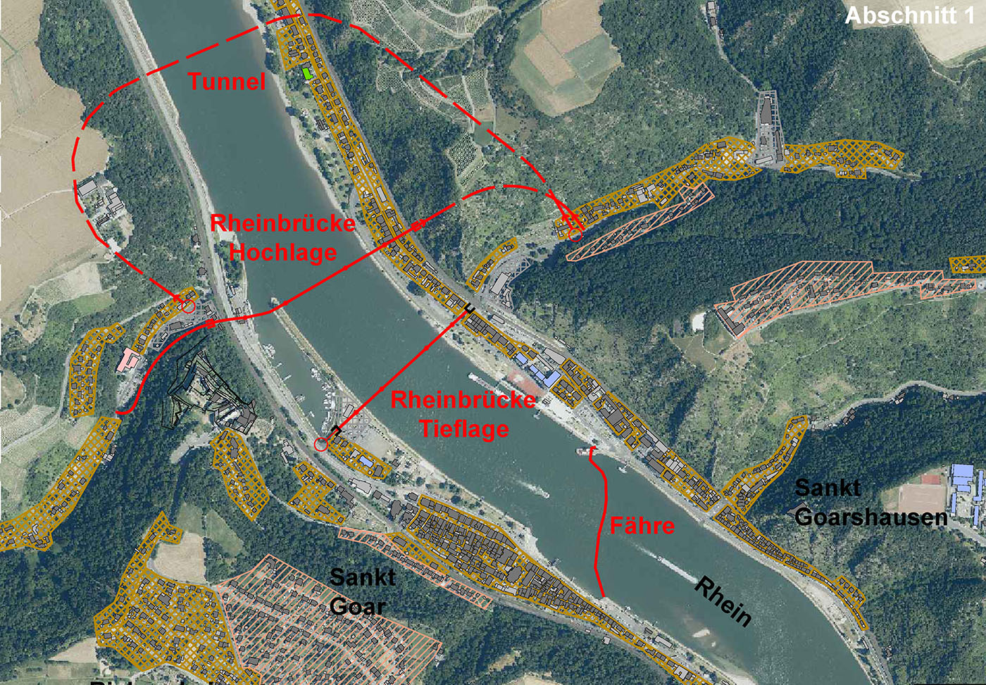 Between the Rhine bridges near Mainz and Koblenz in Rhineland-Palatinate, a Rhine crossing for motor vehicles is to be provided at the level of the municipalities of St. Goar and St. Goarshausen. In preparation for the regional planning procedure, which was initiated in February 2021, numerous investigations were carried out, including a noise study in accordance with the requirements of the Federal Immission Control Act.